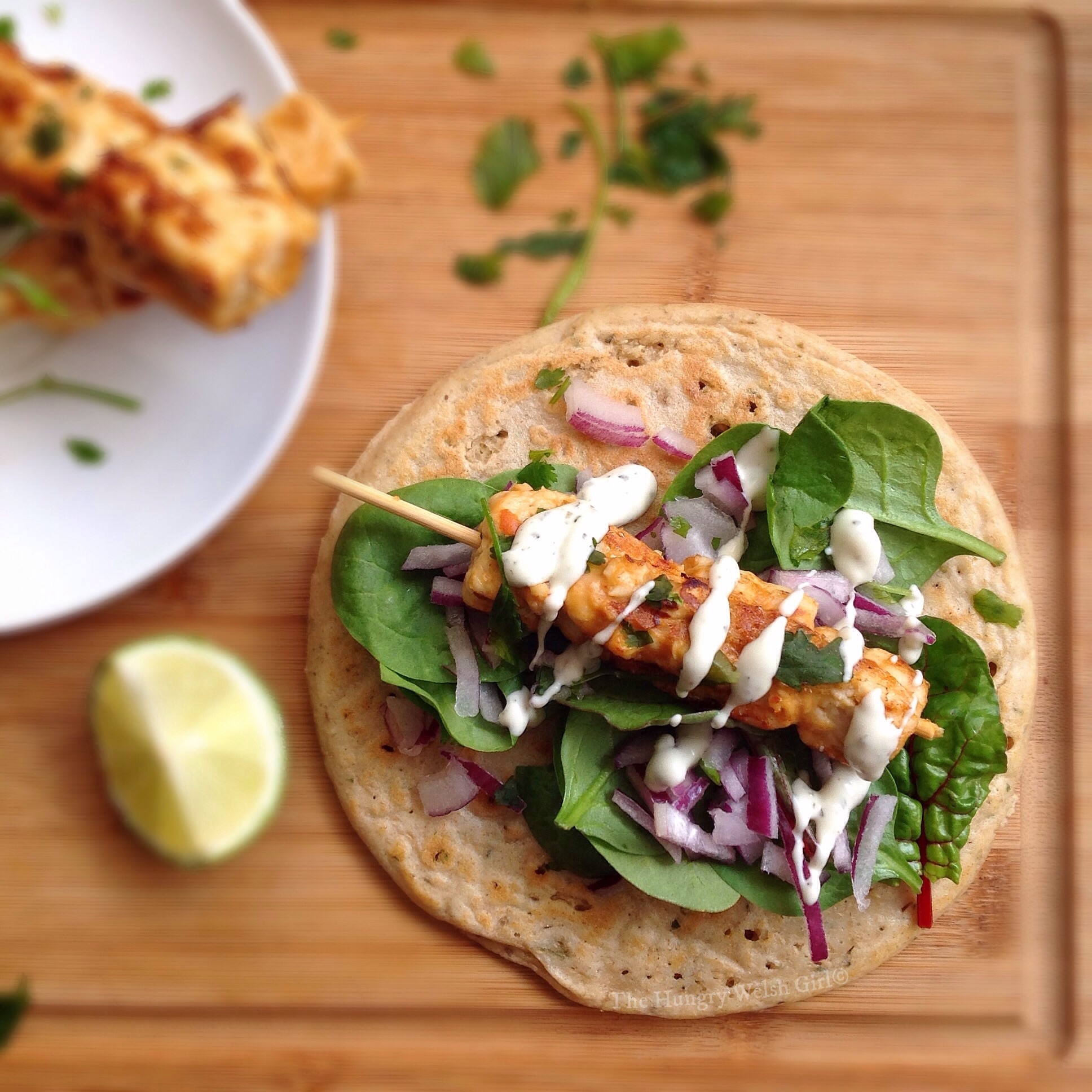 All that’s left now is to add your salad, satay kebabs and yoghurt and mint dressing to the power wrap and enjoy.