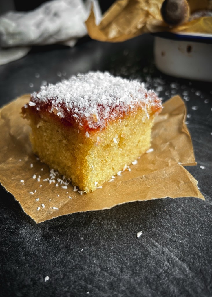 I’m back after a rough few years dealing with my mental health and I have returned with some new recipes that I’ve been hoarding too. This recipe is for a coconut jammy square cake; think back to those days of youth where we didn’t have a care in the world and we devoured coconut jammy squares topped with custard by the bowl.