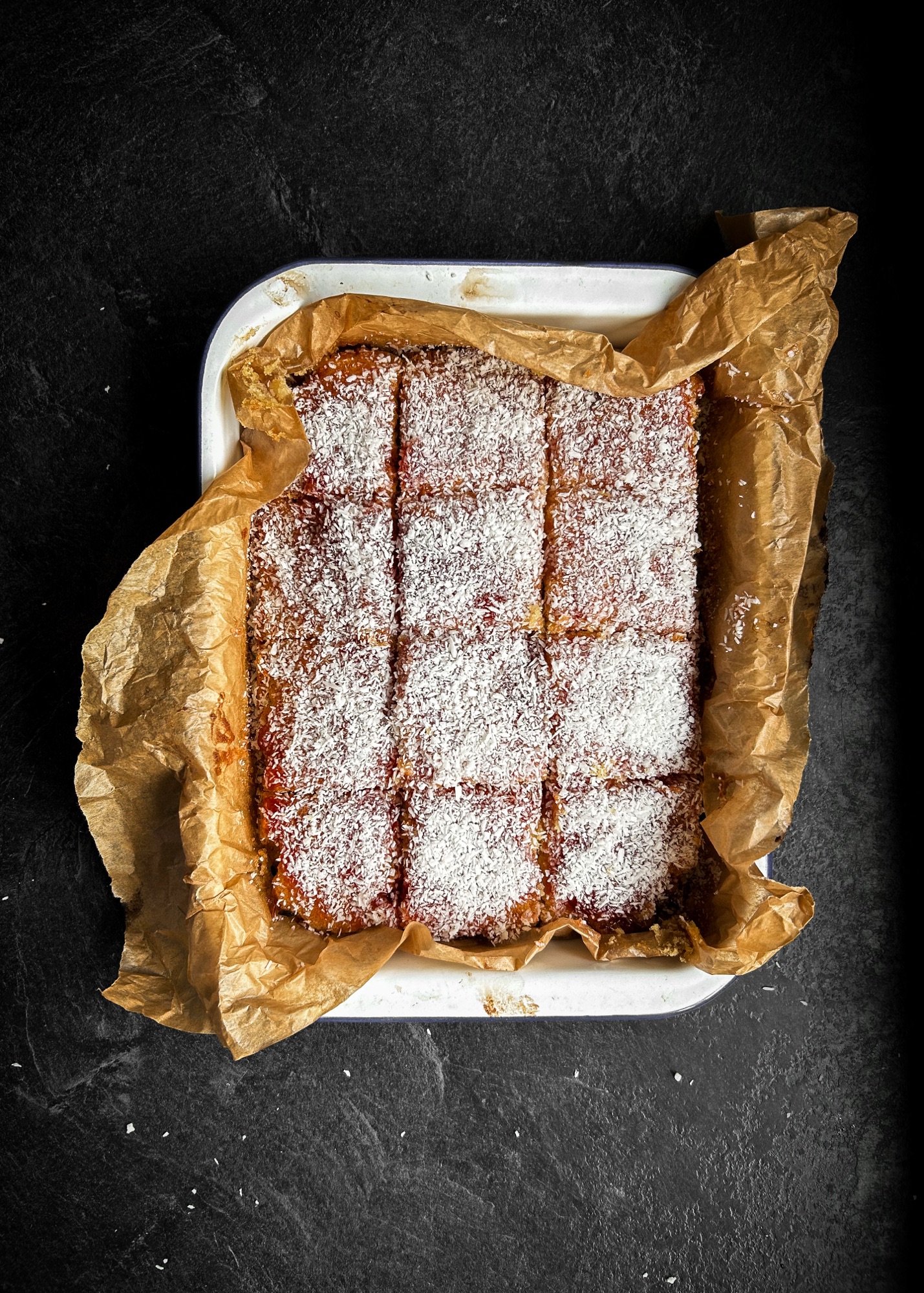 I’m back after a rough few years dealing with my mental health and I have returned with some new recipes that I’ve been hoarding too. This recipe is for a coconut jammy square cake; think back to those days of youth where we didn’t have a care in the world and we devoured coconut jammy squares topped with custard by the bowl.
